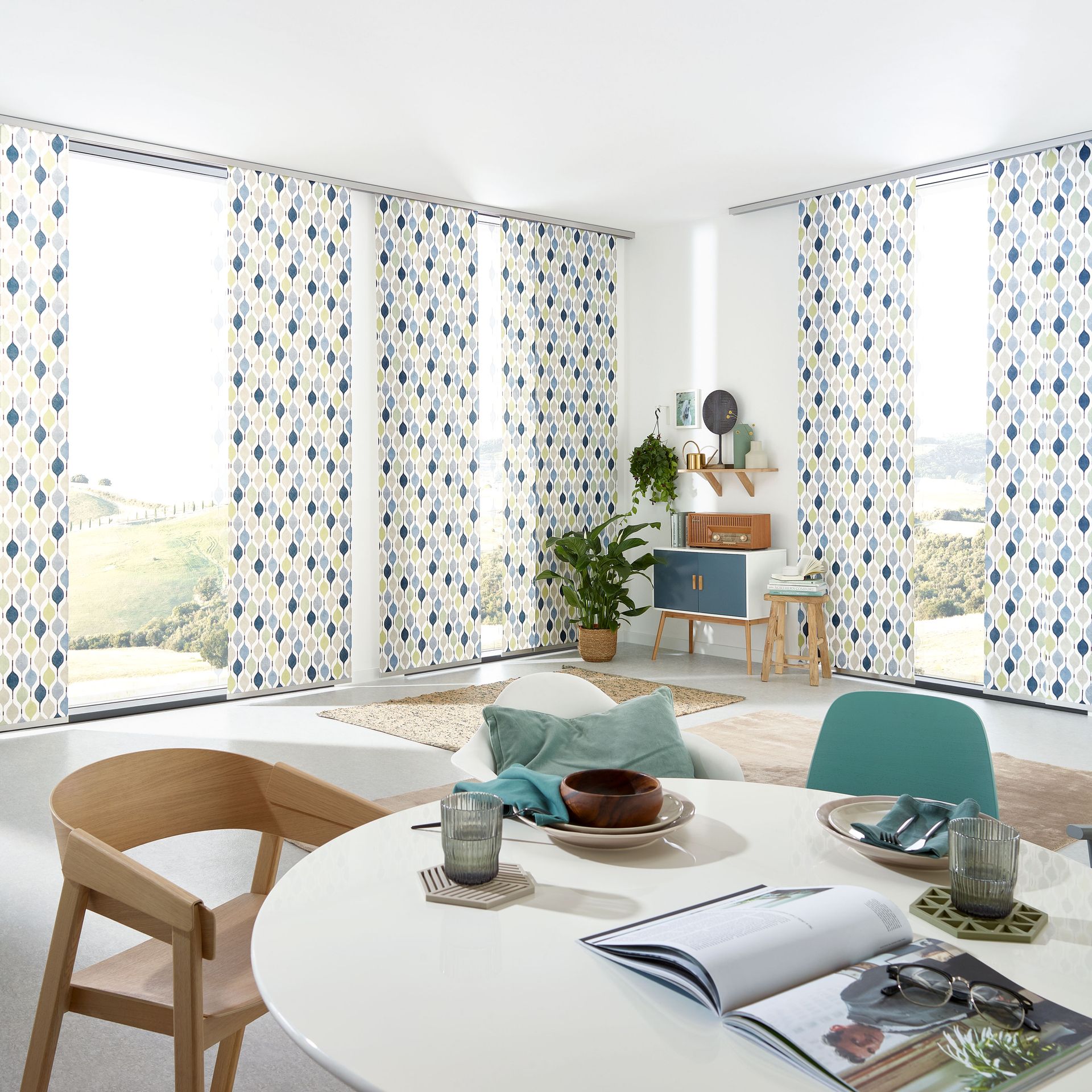 Die Paneele sind in individuellen Größen und praktisch unendlich vielen verschiedenen Stoffdesigns erhältlich. Die Paneele lassen sich einfach abnehmen und austauschen (Befestigung mittels Klettband). Die Montage der Schiebevorhänge erfolgt wahlweise an Wand oder Decke. Besonders für große Fenster, Glasfronten oder als Raumteiler bestechen Flächenvorhänge mit ihrer modernen, reduzierten Formensprache.