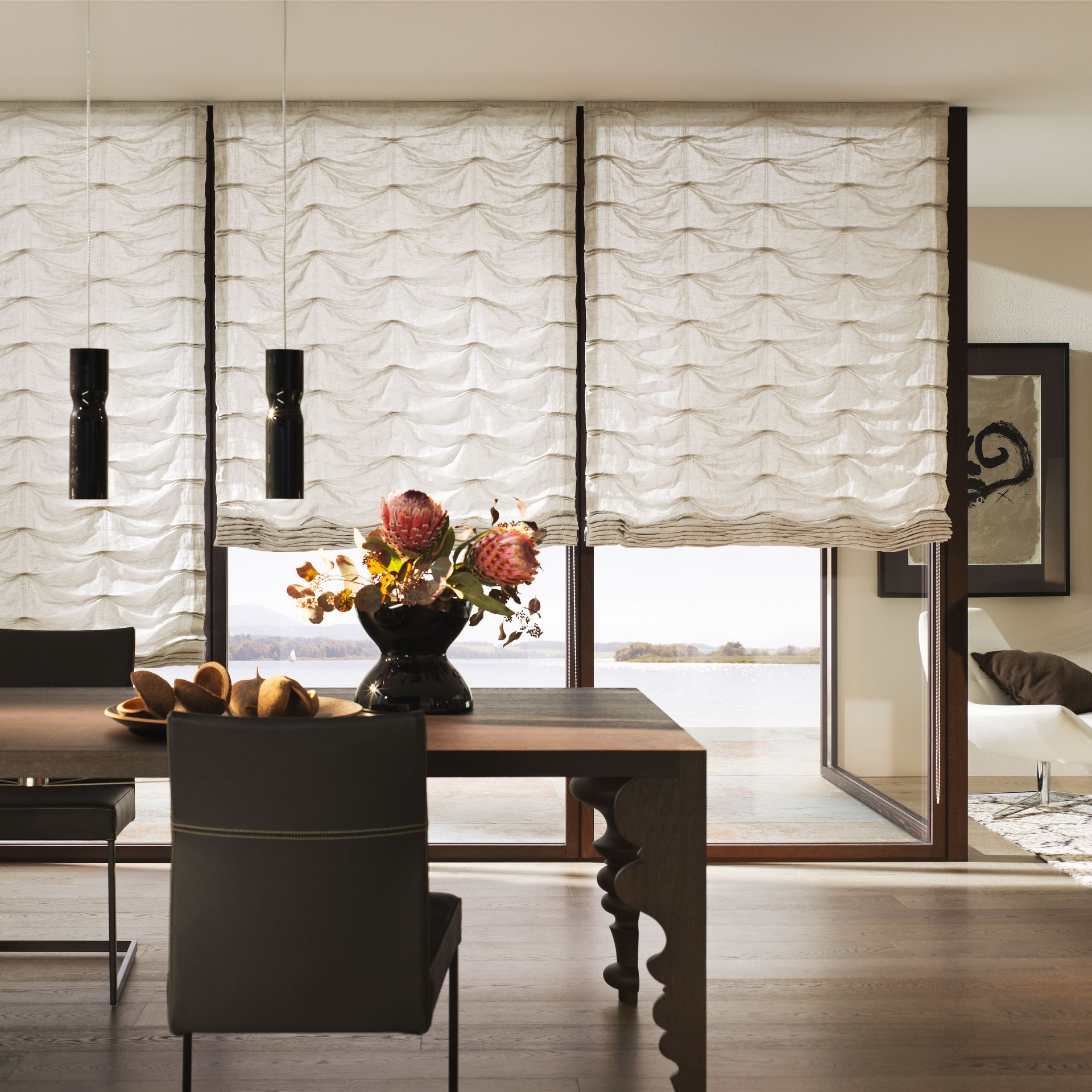 Das Raffrollo ist die perfekte Symbiose aus Technologie, Handarbeit und Kreativität. Individuell ausgewählte Stoffe werden manuell nach Maß zum Faltrollo konfektioniert und erlauben so eine flexible Raumgestaltung. Die Anwendung reicht von konventionellen Fenstern und Terrassentüren über Giebelfenster und gebogene Anlagen bis zu Dachfenstern. Besonders interessant ist, dass beim Raffstore im Gegenzug zum klassischen Vorhang links und rechts des Fensters kaum bzw. kein Platz benötigt wird, um den Stoff zu parken, da die Bahnen nur vertikal und nicht konventionell horizontal bewegt werden.